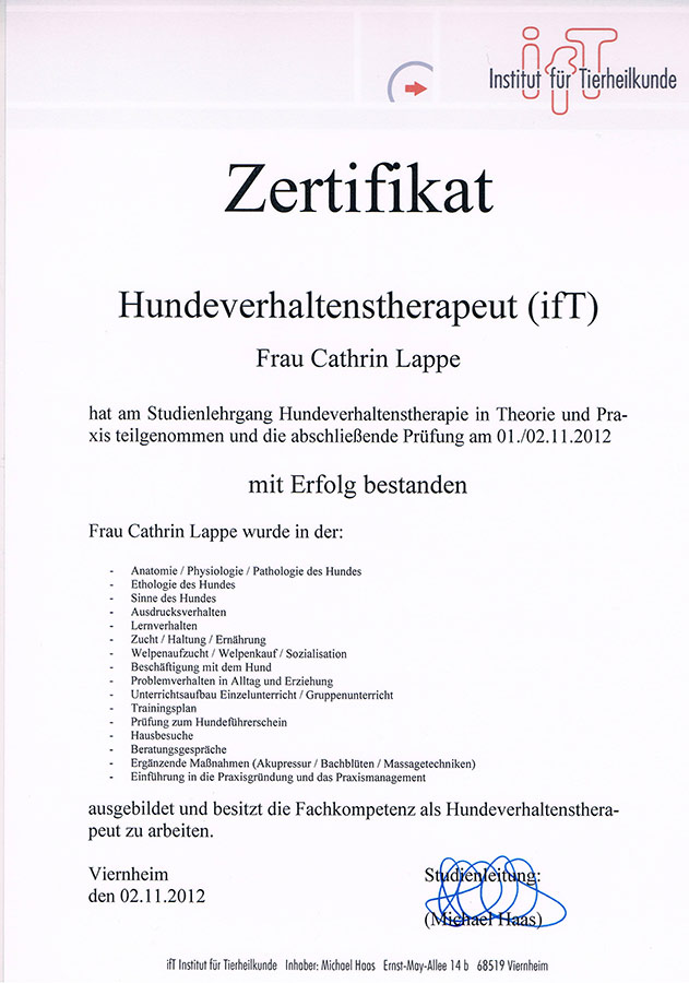 Zertifizierung als Hundeverhaltenstherapeut (ifT) (2011/2012)